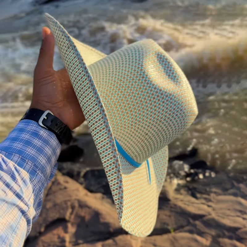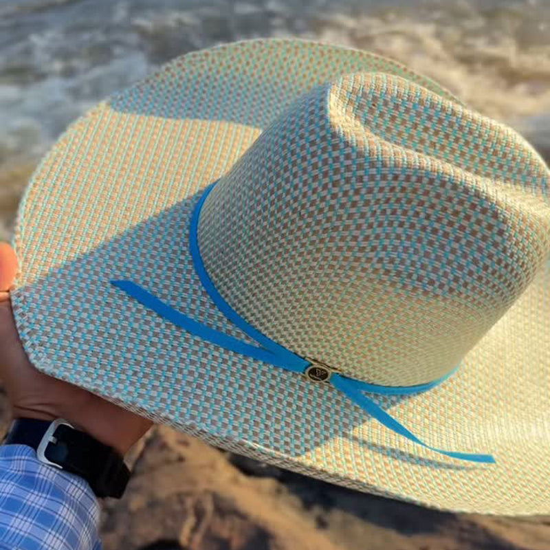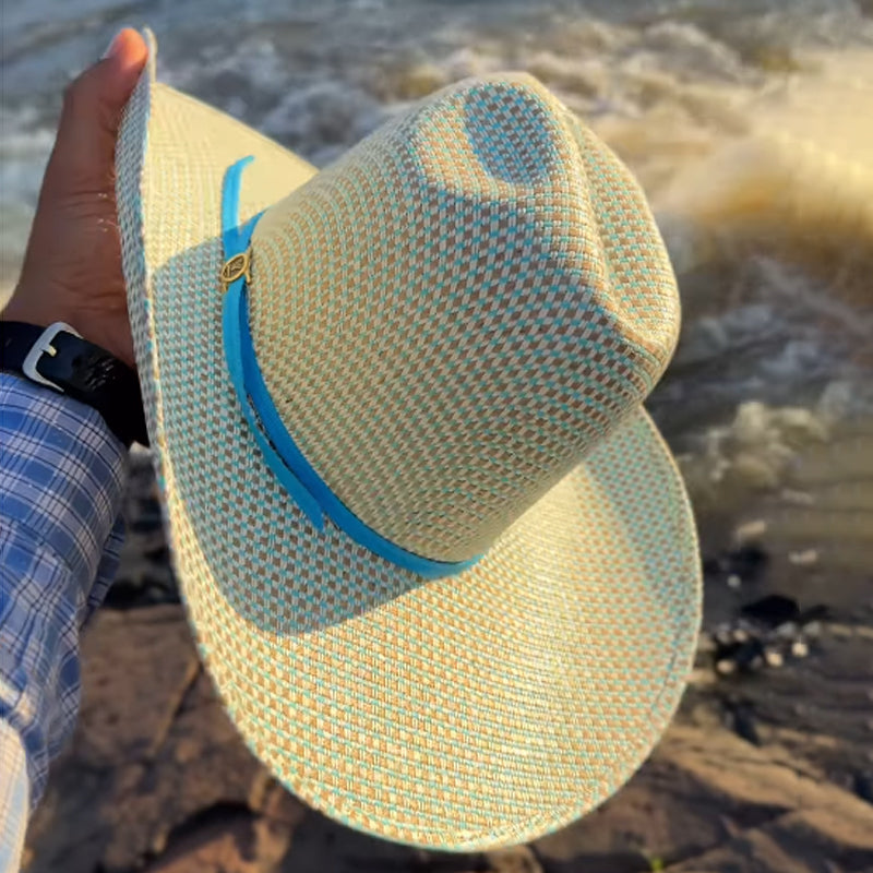 Embrace sunny days and Western charm with this light blue - checkered straw cowboy hat. Handwoven from breathable straw, it features a vibrant blue ribbon band for a pop of color. The wide brim offers ample sun protection, while the classic cowboy silhouette ensures timeless style. Perfect for beach outings, country festivals, or adding a breezy, laid - back vibe to your summer looks—this hat blends comfort, function, and coastal - Western flair.
