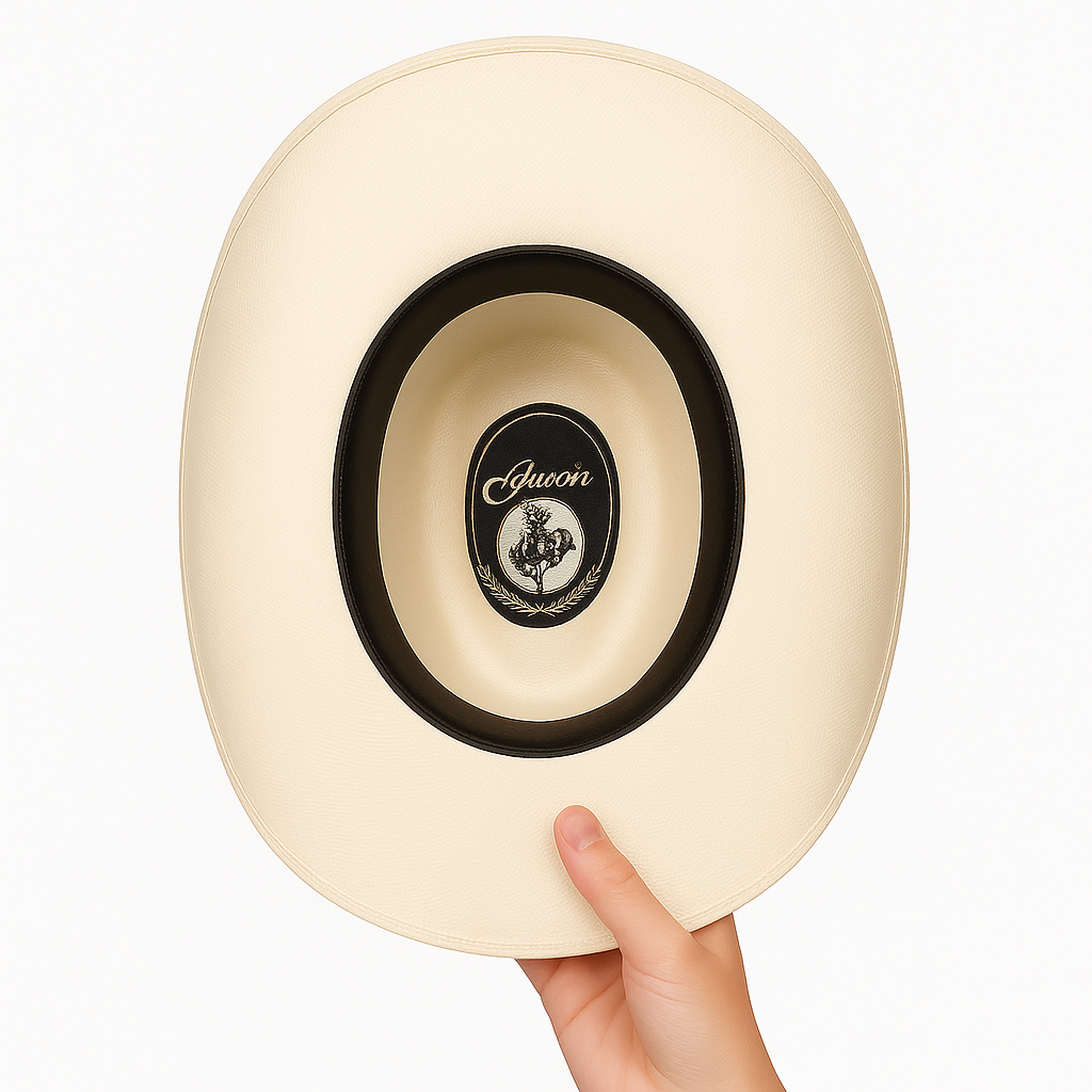 - Design: Flat crown, wide brim; black ribbon band with green accent