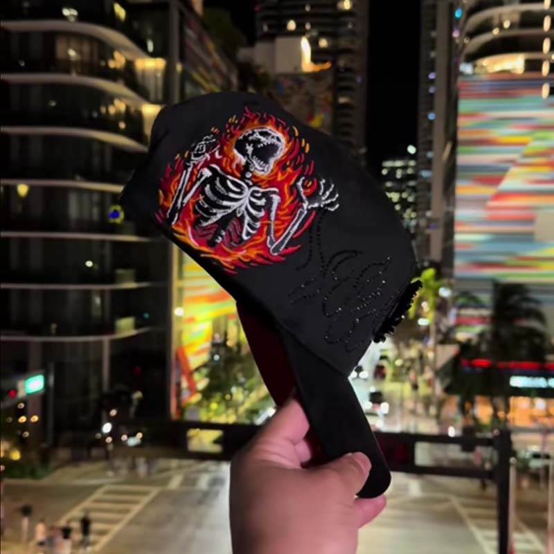 Ignite your street style with this black baseball cap featuring a bold flame - skeleton embroidery. The intricate, fiery design adds a rebellious, edgy vibe—perfect for standing out in urban crowds or at nightlife events. Crafted from durable fabric, it offers a comfortable fit and adjustable strap, blending style and functionality seamlessly. Embrace the night and make a statement with a cap that’s as fearless as you are.