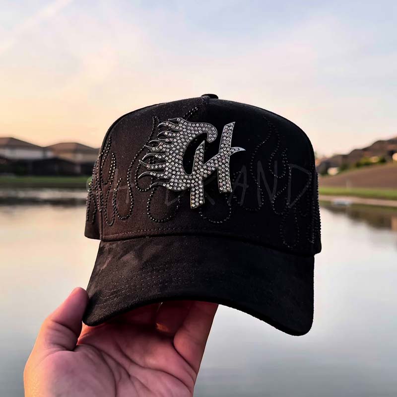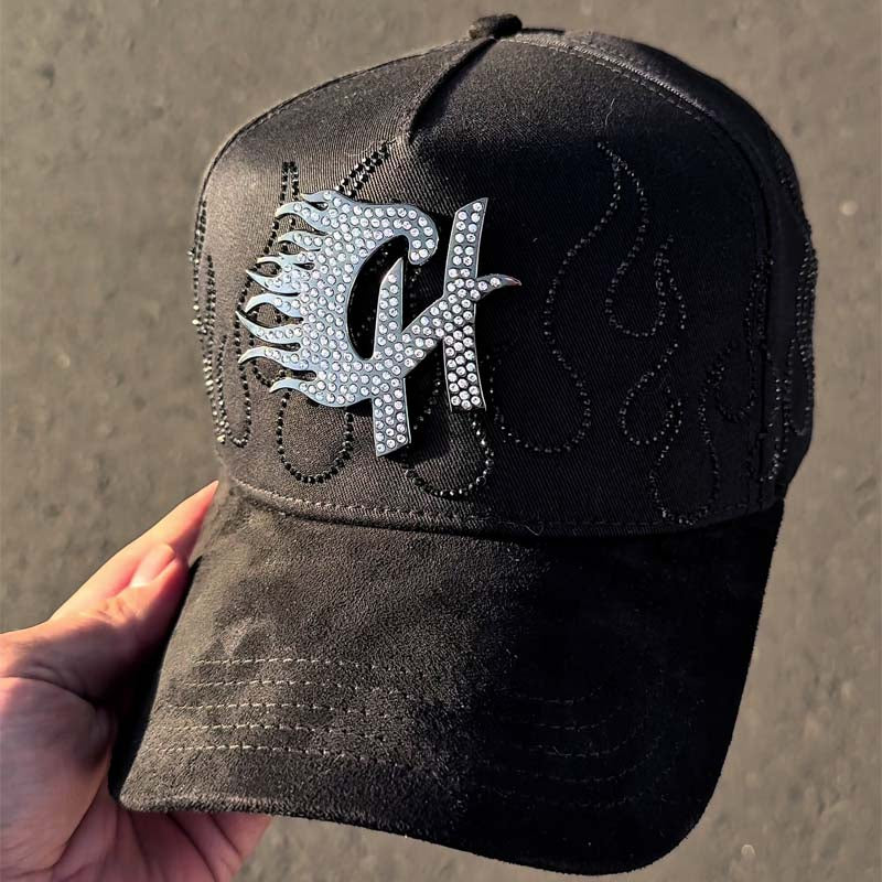 - Design: Black base; flame - skeleton embroidery; subtle vent details; adjustable strap