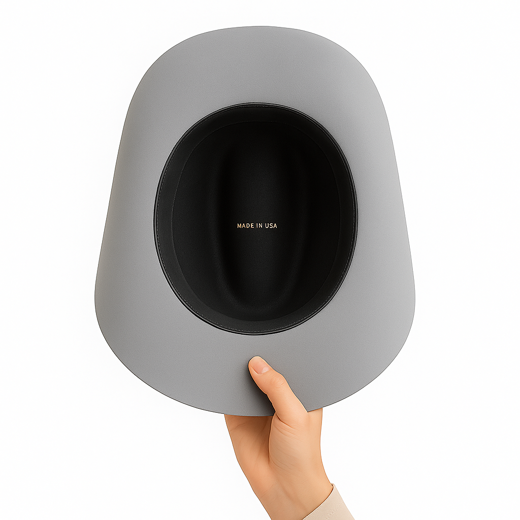- Design: Structured crown, wide brim; minimalist gray hat band with metal accent